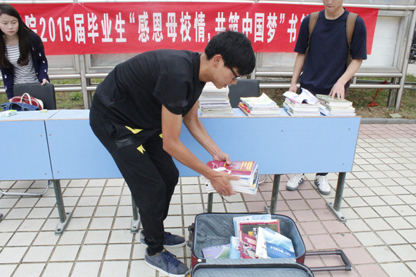 “英语四、六级的词汇书,历年真题,还有我很喜欢的课外书,我一共捐了大概十几本吧。”2011级新闻2班的班长李康说,早上七点,他就去了捐书现场,班级共捐了上百本书,“把书捐给学院也许是我们离校前唯一能为母校和学院做的事了,我也希望我们的书能在学弟学妹中一代代的传下去。”